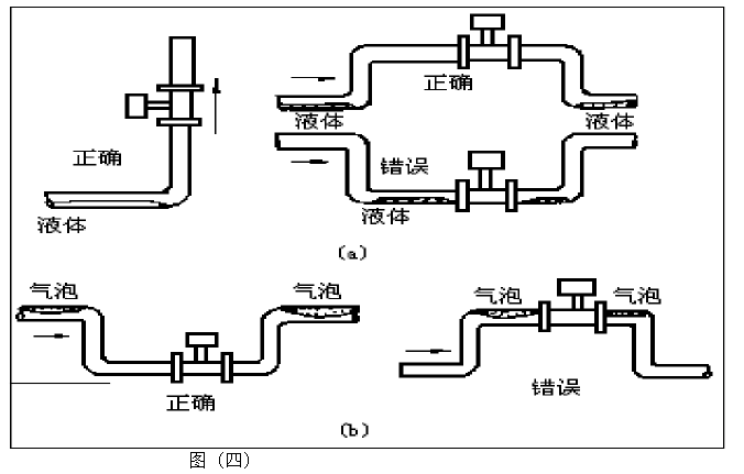 5. 測(cè)量氣體時(shí),在垂直管道安裝儀表,氣體流向不限。但若管道內(nèi)含少量液體,為了防止液體進(jìn)入儀表測(cè)量管,氣流應(yīng)自下而上流動(dòng),如圖(四)a所示